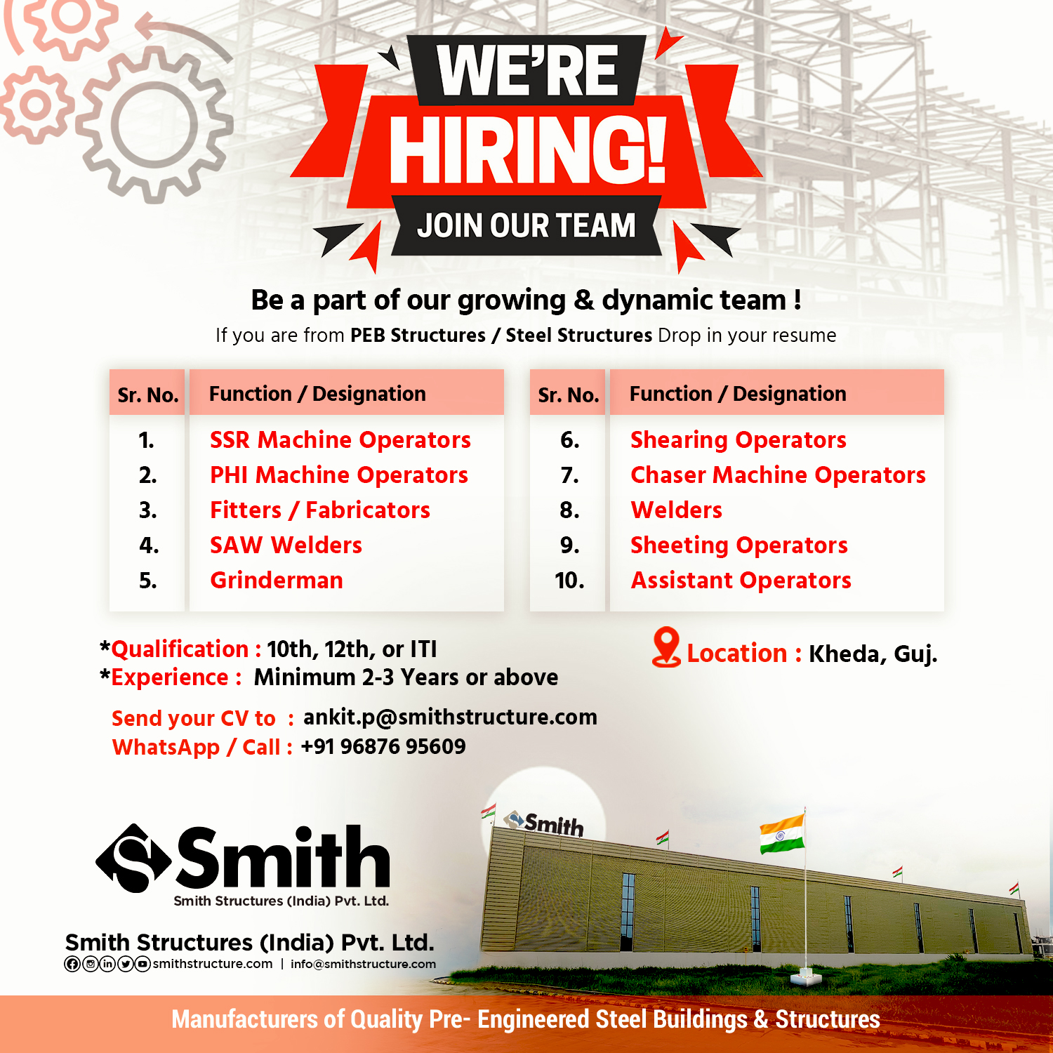 Great Opportunity at PEB manufacturing Plant for 10,12, ITI with 2-3 yrs experience in PEB Industry